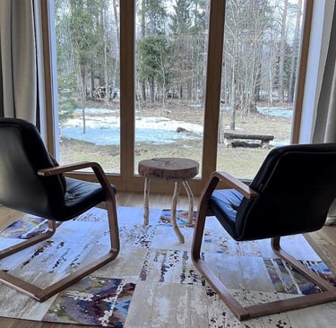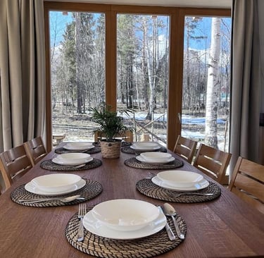 Útulný interiér vytvorený použitím teplých, prírodných materiálov. Veľké presklenia Eurookien poskytujúce úžasné epické výhľady a vytvárajúce hlboký pocit prepojenia s okolitou prírodou. Fínsky mastencový krb s pekárnikom NUNNAUUNI pre spríjemnenie večerných posedení v kruhu rodiny či priateľov.